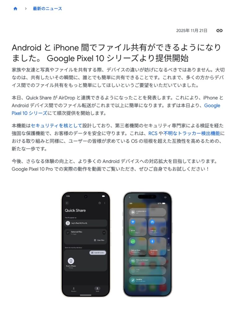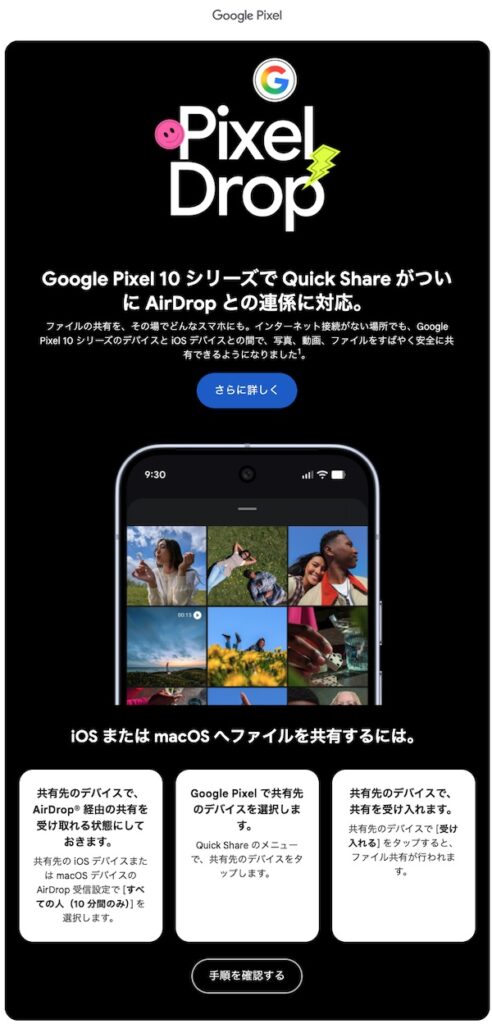「Google Pixel 10 シリーズで Quick Share がついに AirDrop との連携に対応」