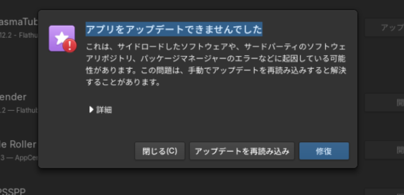 elementaryOSを使っていて、たまに以下のようなランタイムのアップデートが来ているのに、更新しようとするとエラーメッセージが出てしまい、更新ができないことがあります。