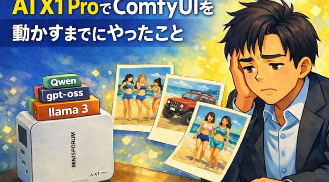 はじめに:Amuseは楽、ComfyUIは別世界だった 年末に駆け込みで衝動買いしたAI X1 Proでローカル画像生成AIを試したい。というわけで、Amuse と ComfyUI の両方を試してみた。 結論から言うと、 … 続きを読む AI X1 ProでComfyUIを動かすまでにやったこと