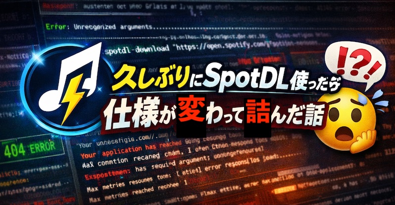 ブログ記事を自分の記憶代わりにもしている筆者であるが、今回久しぶりにspotDLで曲をダウンロードしようとしたら、すっかり仕様が変わっていて、少しハマったので備忘録としてメモしておく。